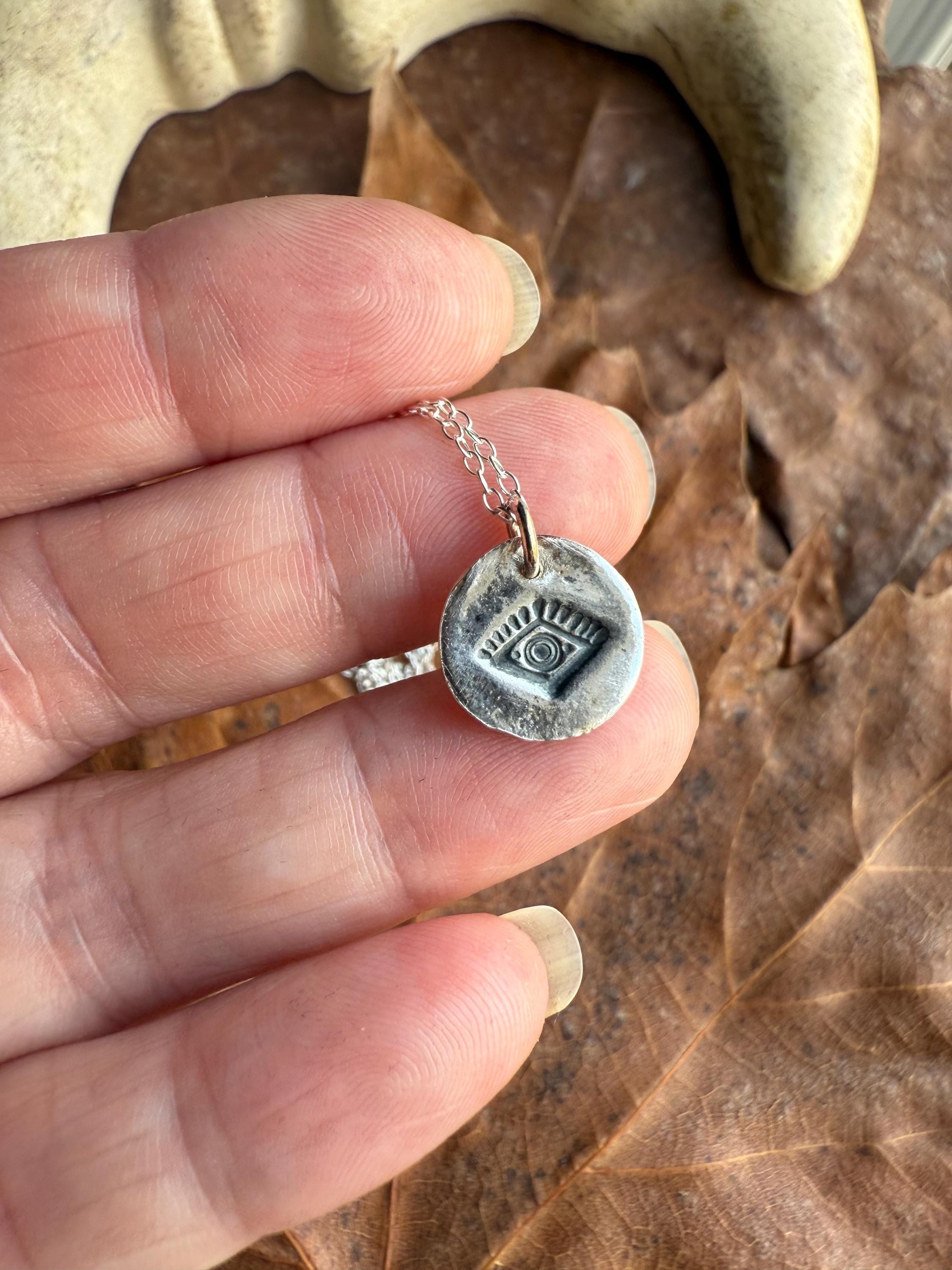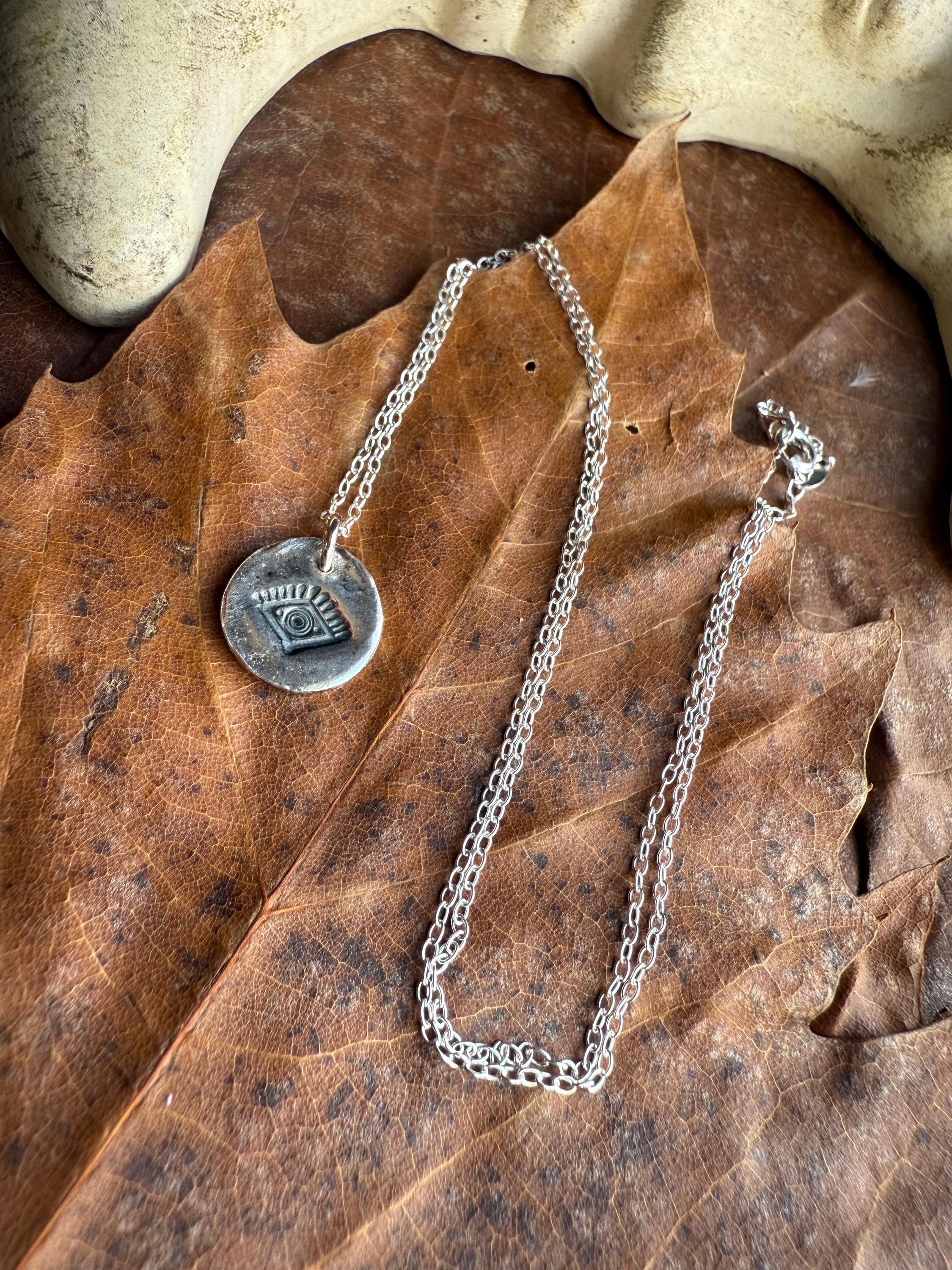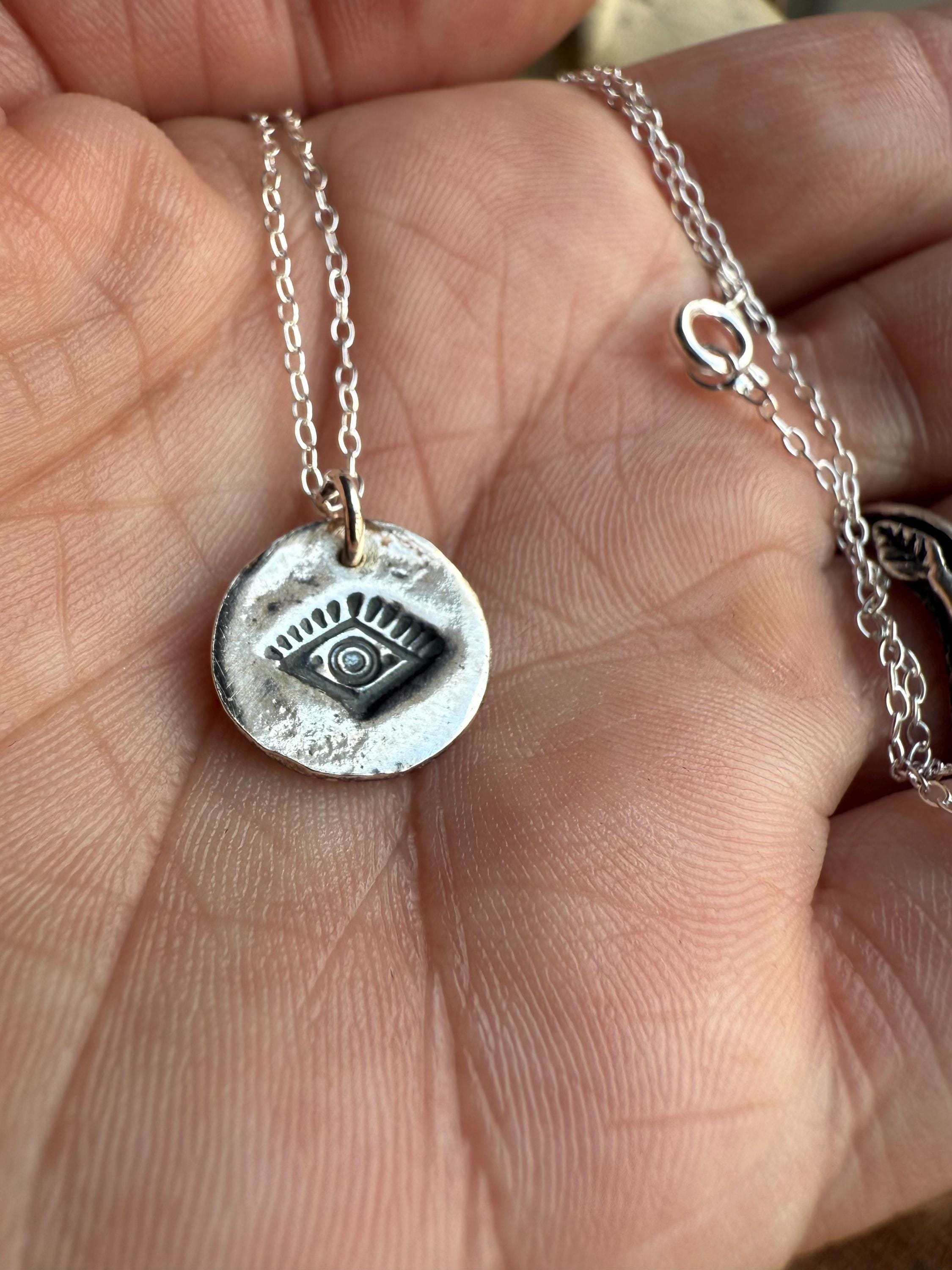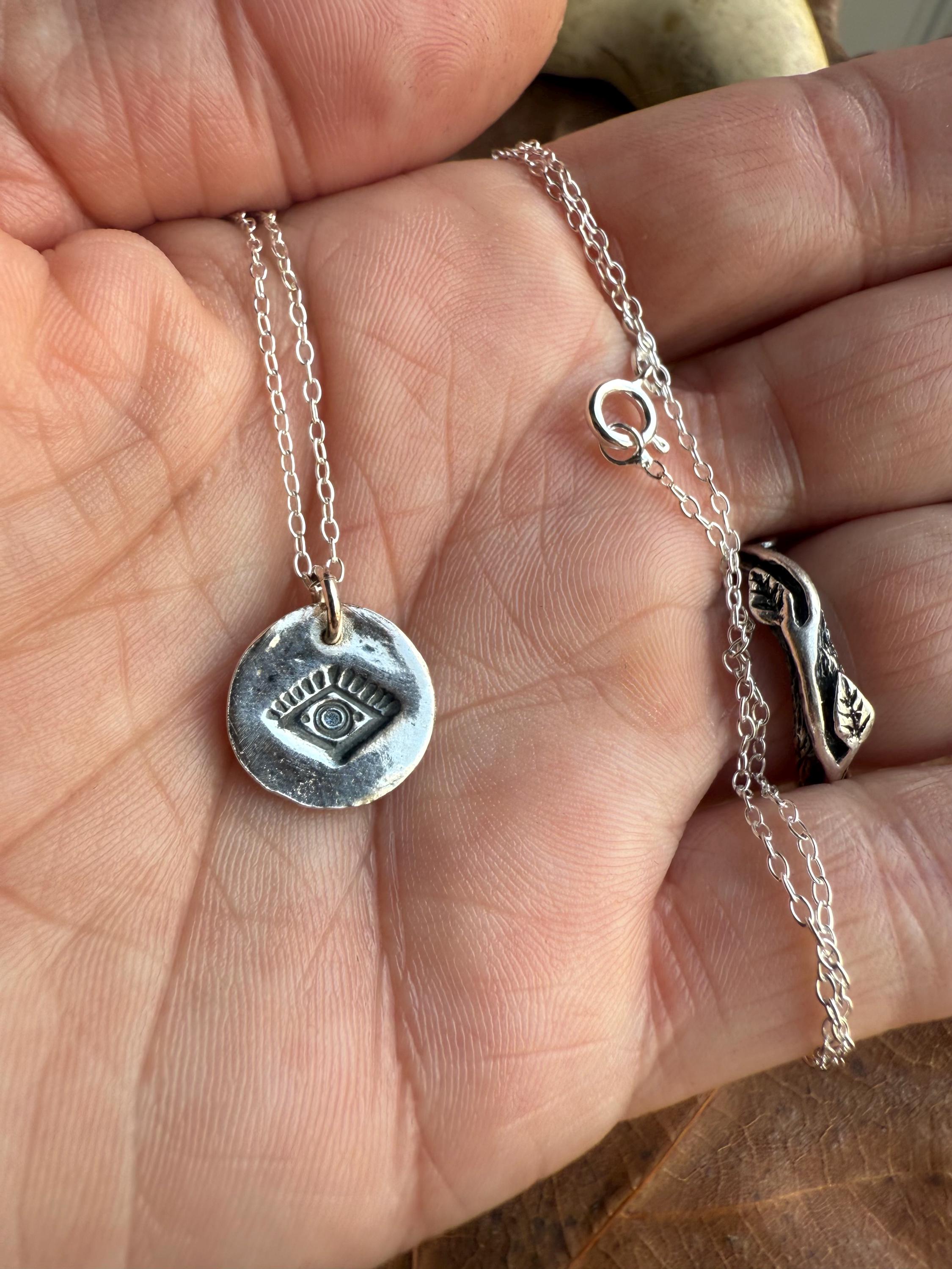 Protective, minimalist, and sustainably crafted – this dainty evil eye necklace features a handmade pendant crafted from recycled fine silver, stamped with a subtle evil eye symbol for a touch of mystical charm. Suspended on a delicate sterling silver chain, it’s perfect for everyday wear or layering with your favourite pieces.
