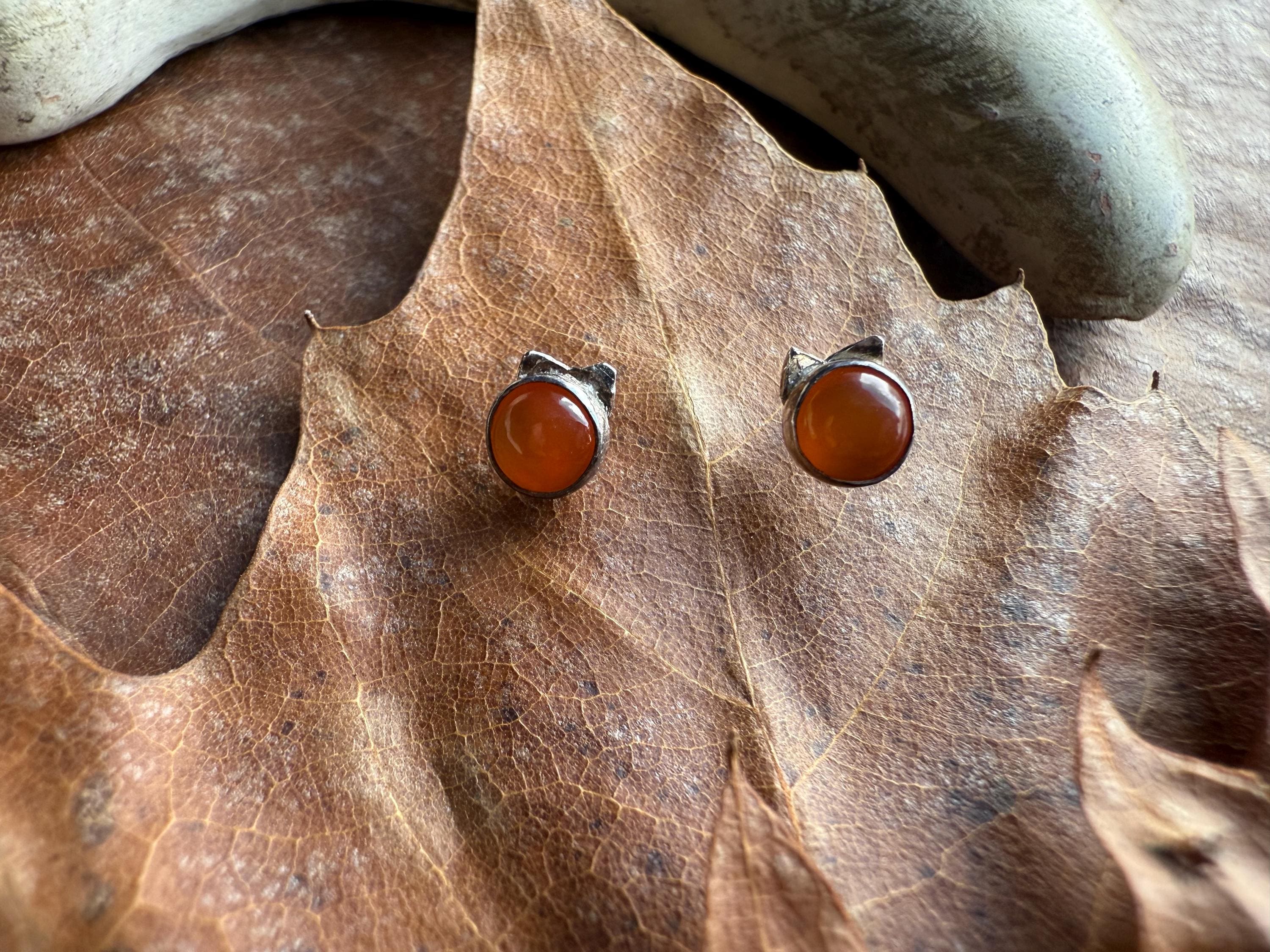 These sweet little earrings bring a touch of playfulness to your everyday. Each one is handmade from recycled silver and set with a tiny carnelian gemstone — a stone known for its warmth, vitality, and energy. To give them character, I added dainty cat-shaped ears in silver, turning them into charming feline-inspired studs. Lightweight and comfortable, they’re the perfect tiny treasure for cat lovers or anyone who enjoys a fun twist on classic gemstone jewellery.