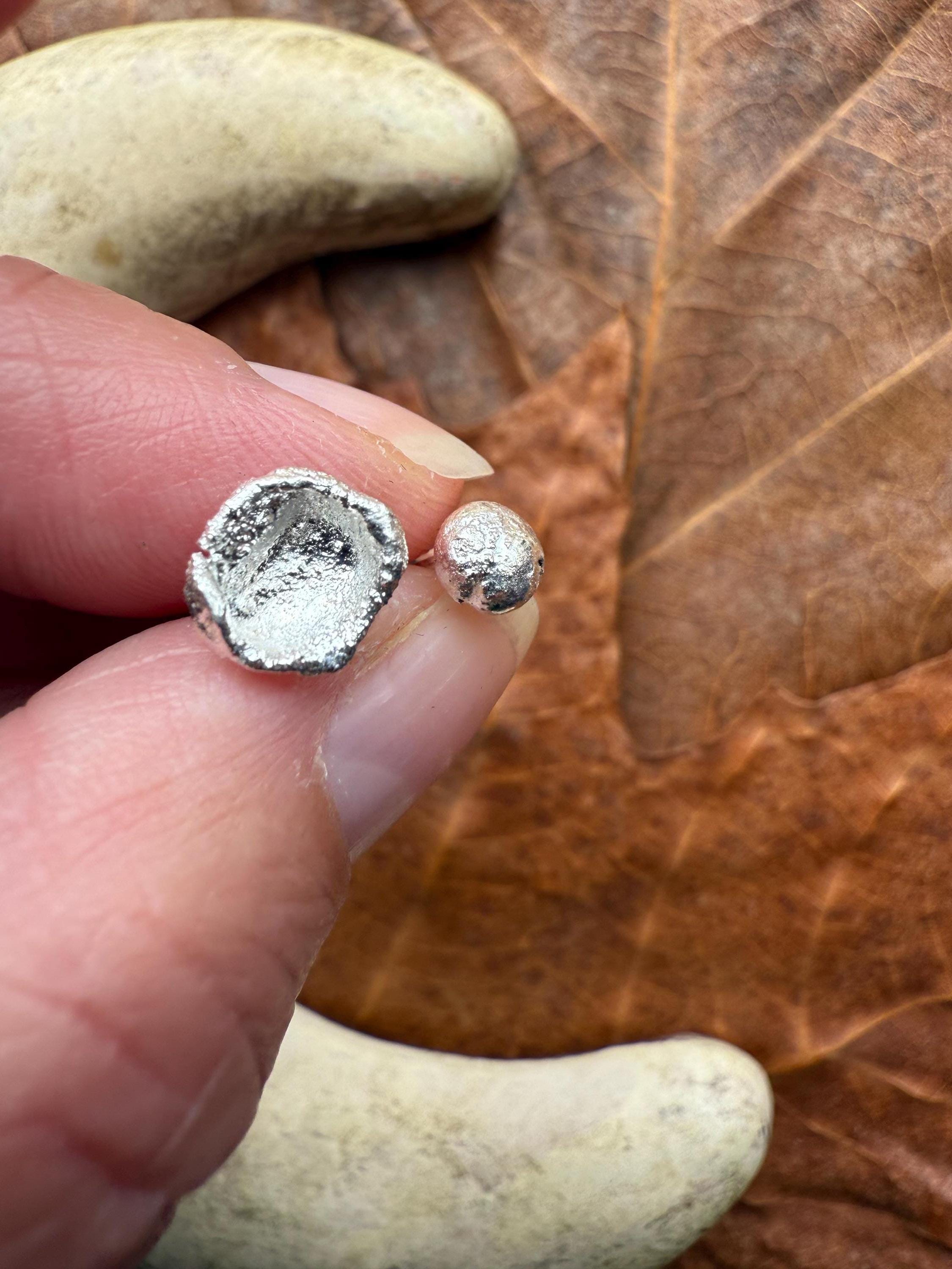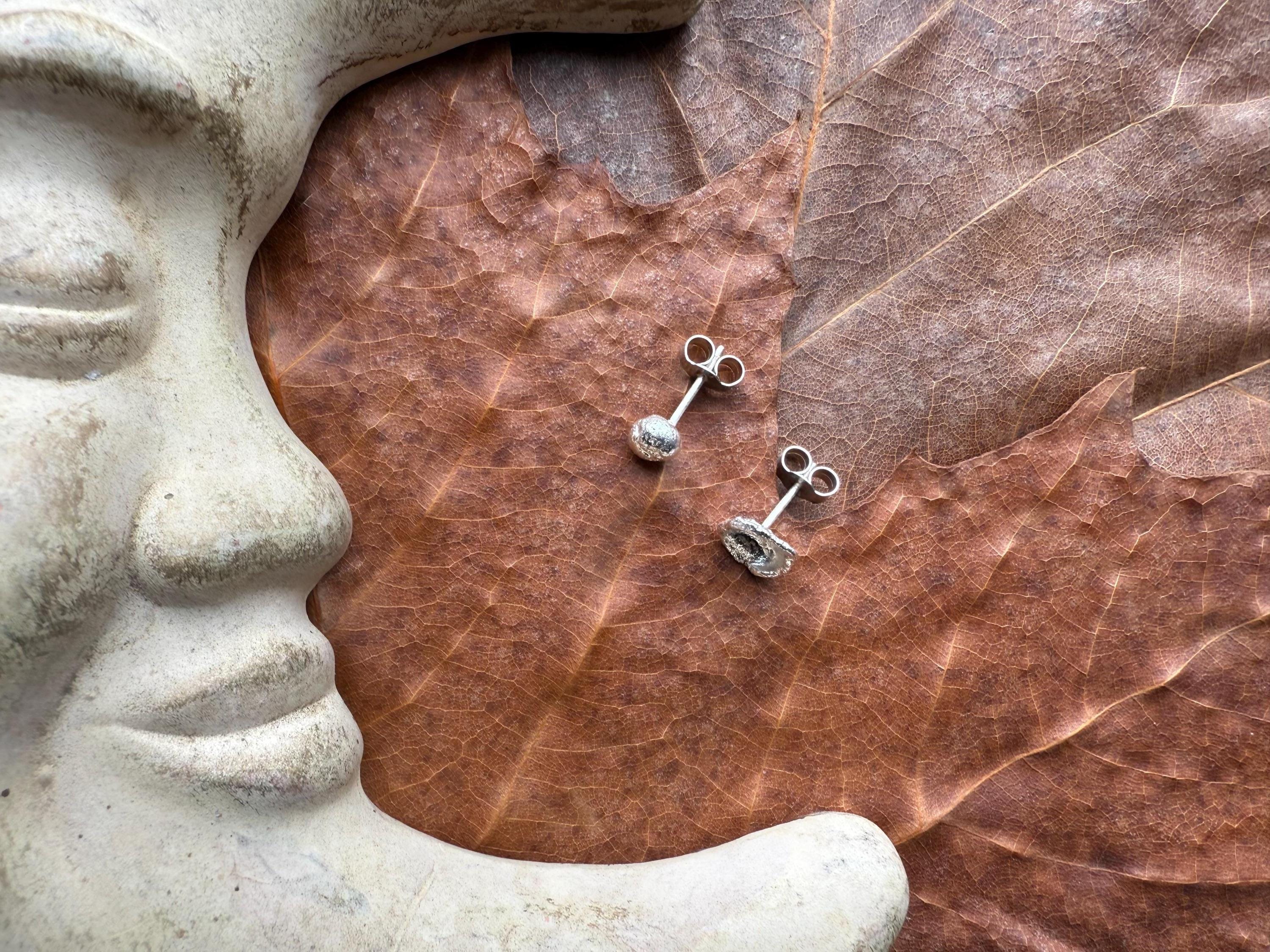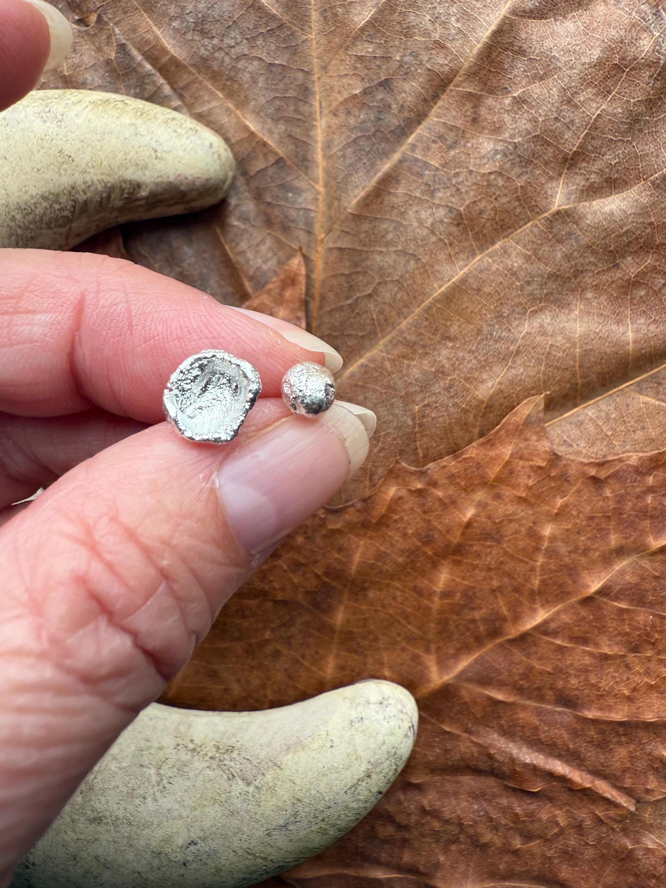 These little studs are sisters, not twins. Each one is created using water-casting — a process where molten recycled silver is poured into water, forming unique, organic shapes that can never be repeated. One earring became a tiny dish, the other a textured silver ball, together creating a perfectly imperfect pair. Lightweight and comfortable, they’re a subtle statement of individuality and the beauty of asymmetry.