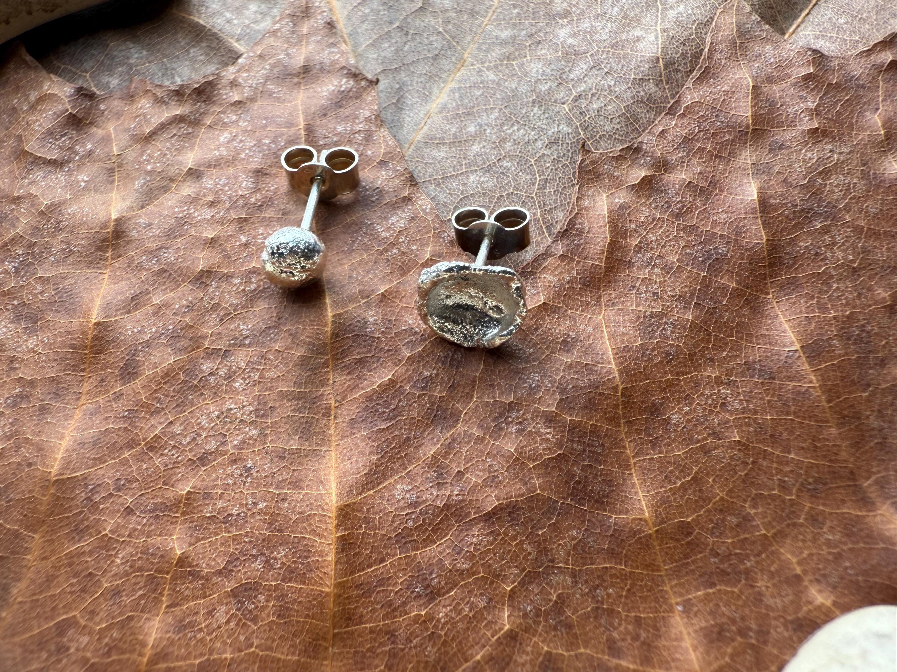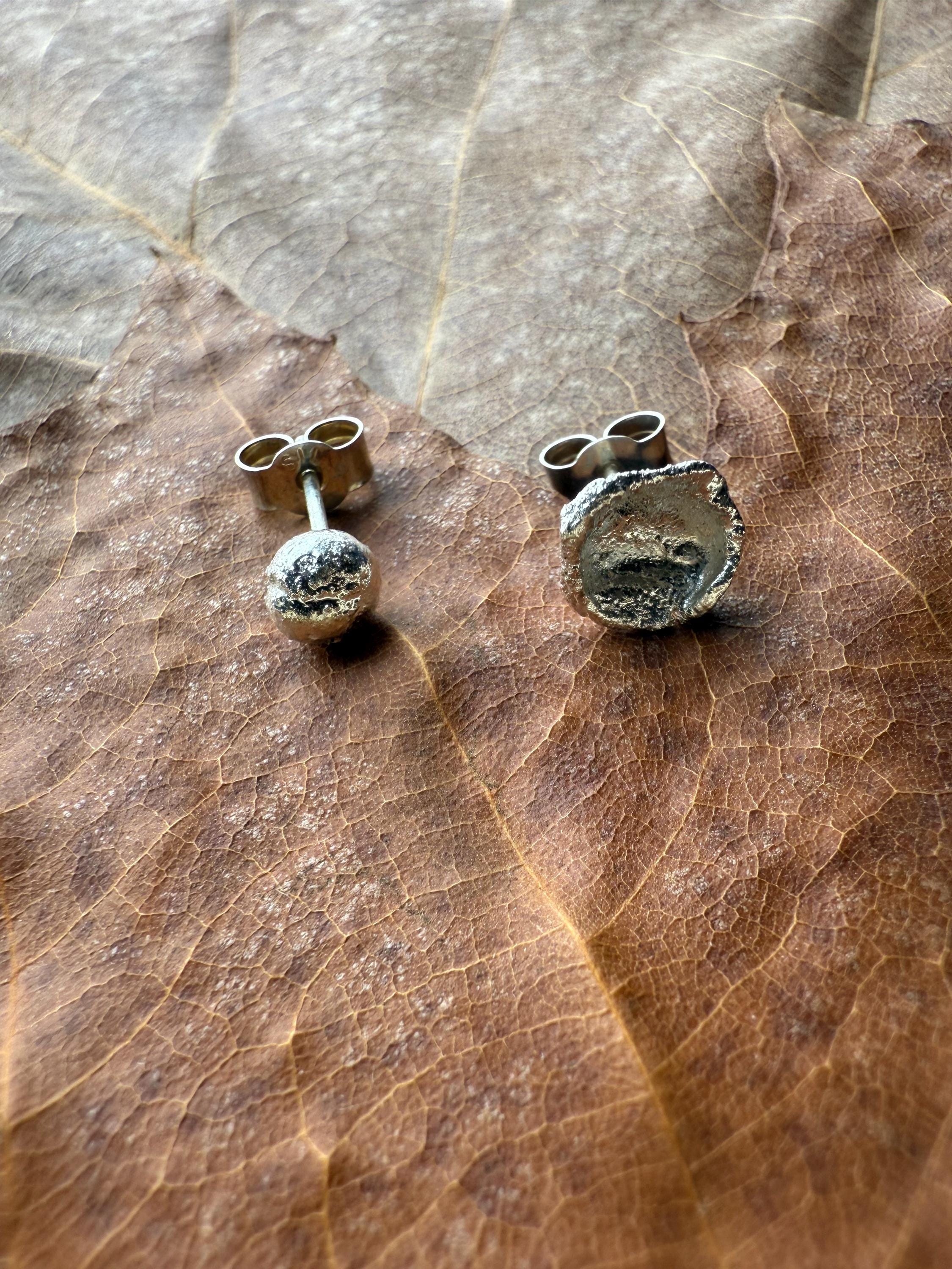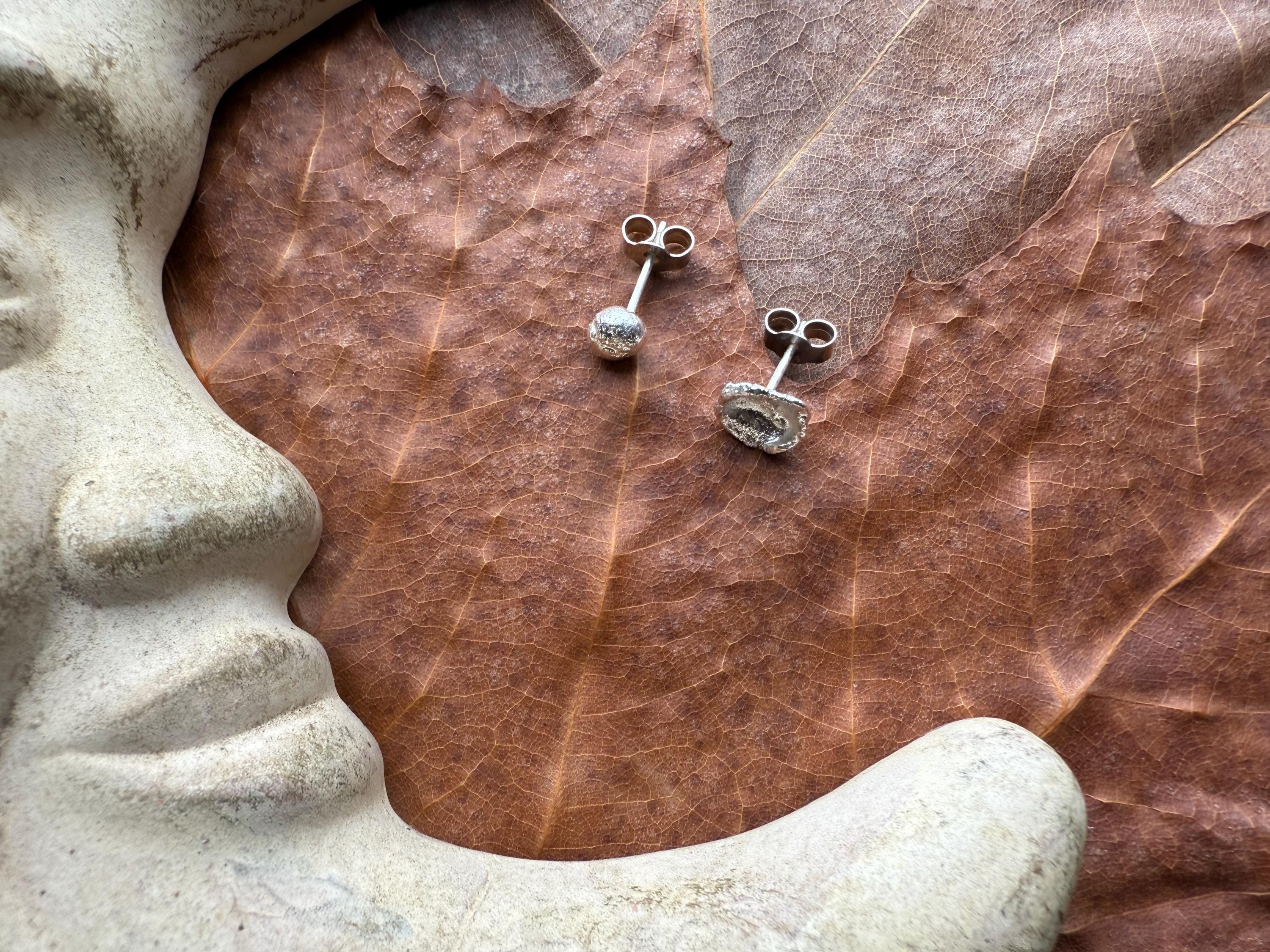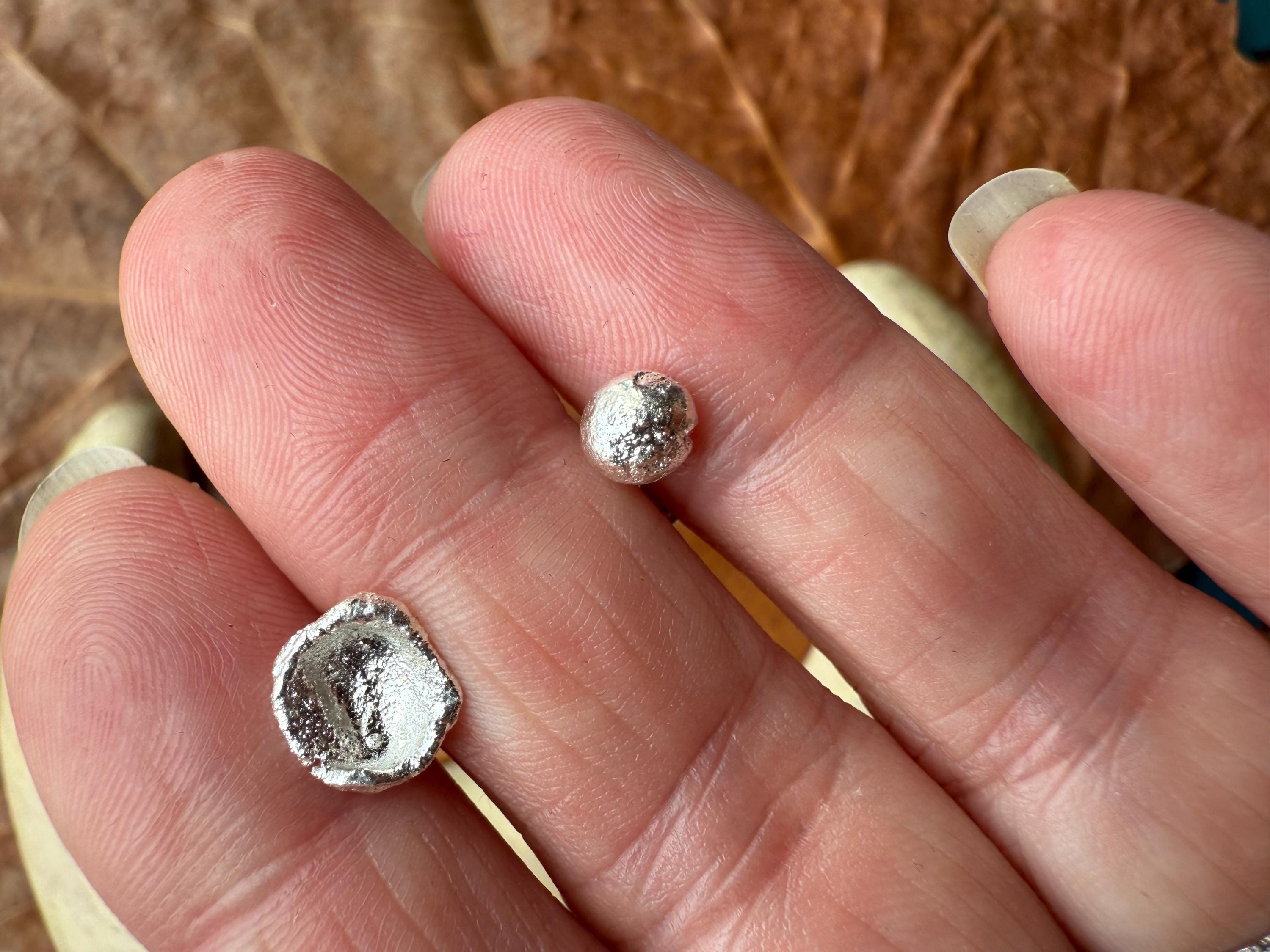 These little studs are sisters, not twins. Each one is created using water-casting — a process where molten recycled silver is poured into water, forming unique, organic shapes that can never be repeated. One earring became a tiny dish, the other a textured silver ball, together creating a perfectly imperfect pair. Lightweight and comfortable, they’re a subtle statement of individuality and the beauty of asymmetry.