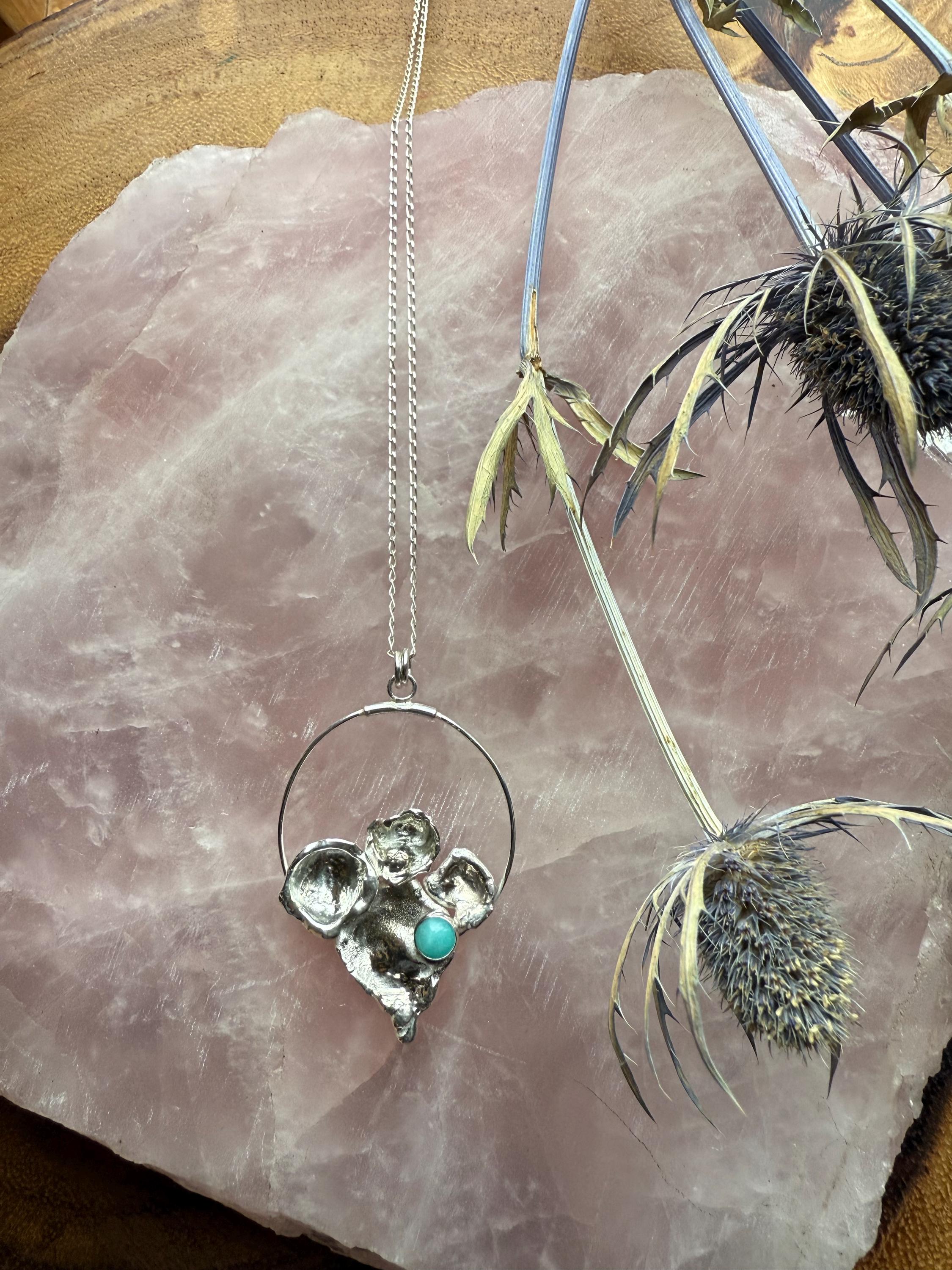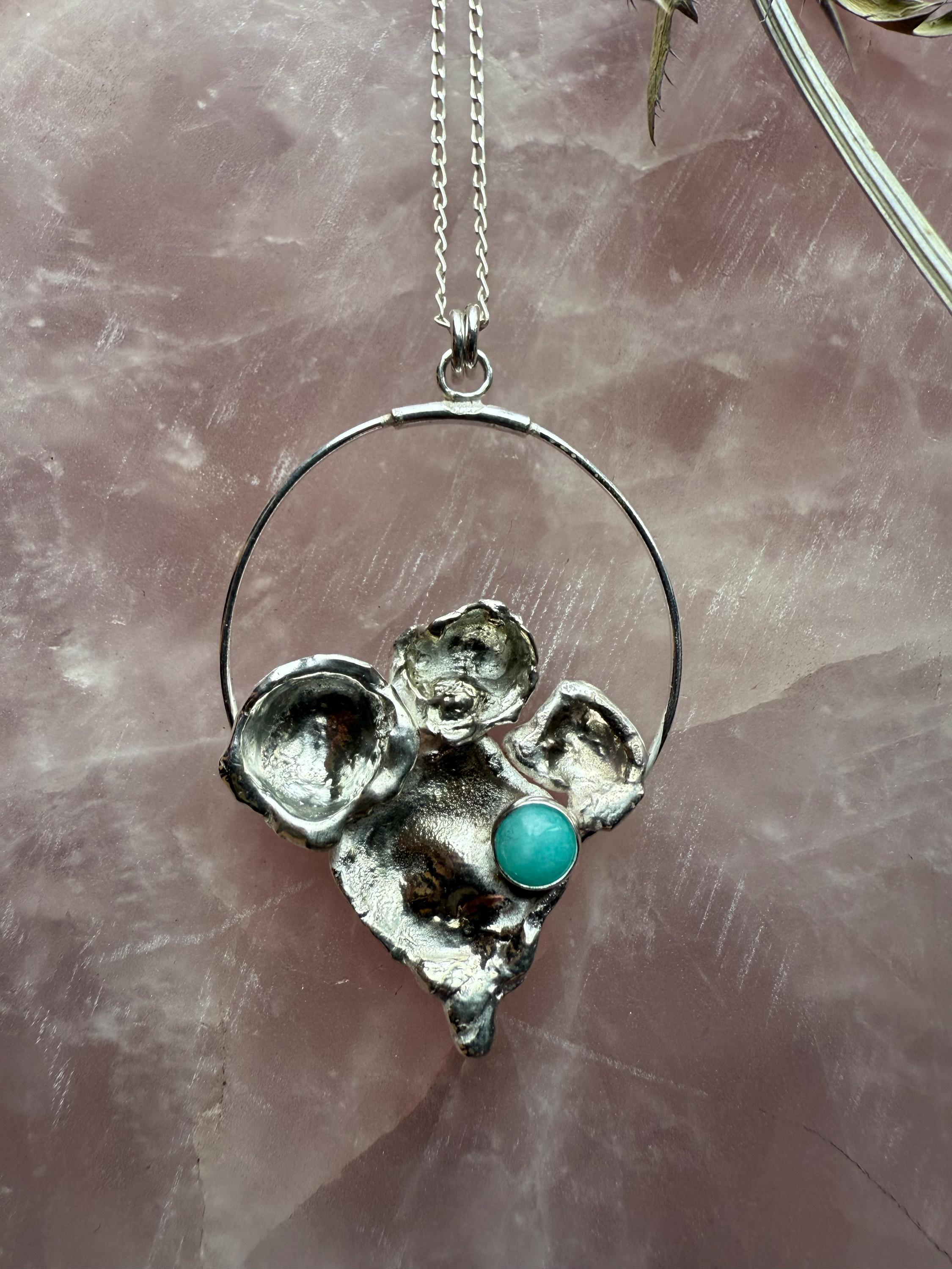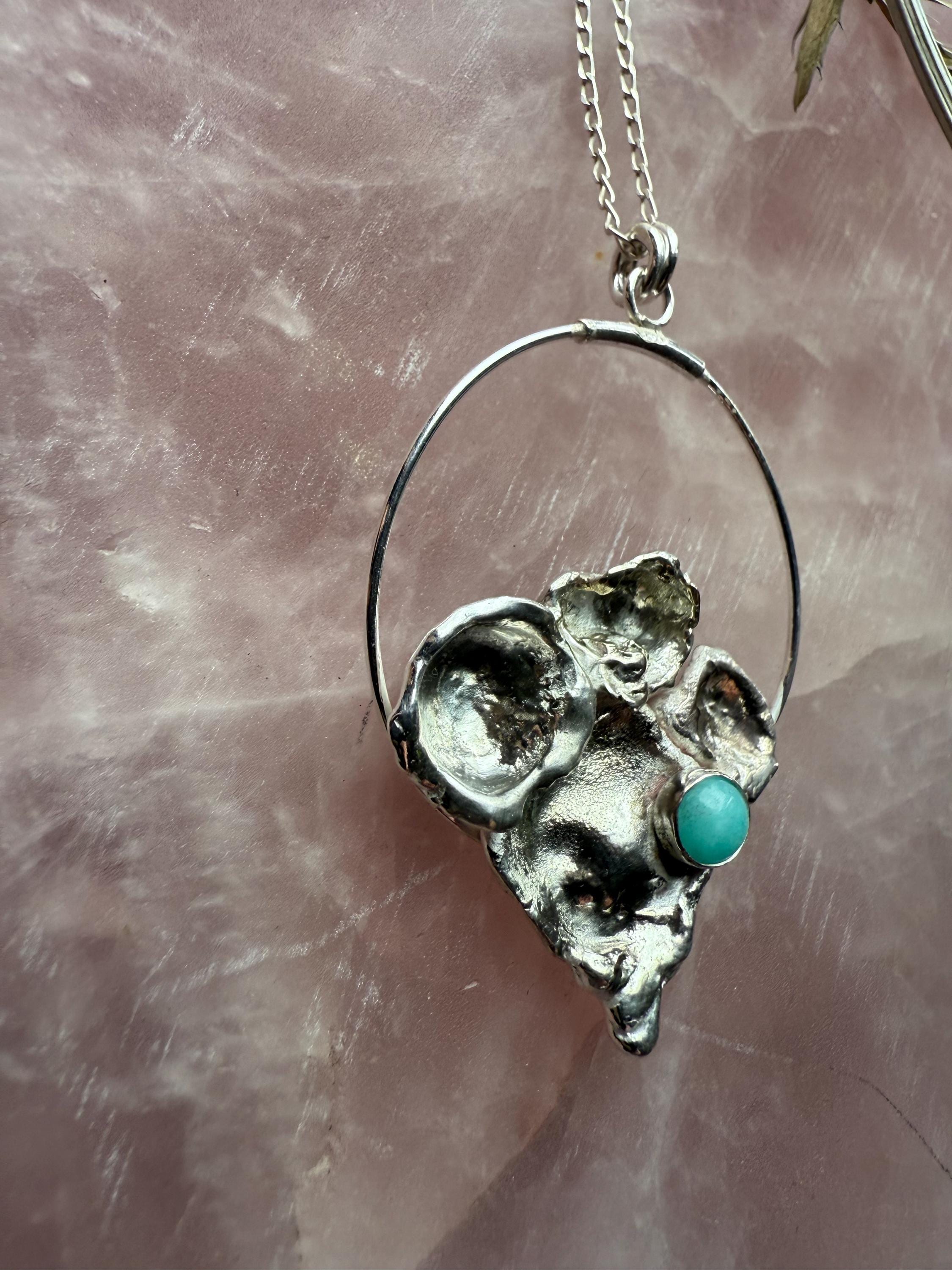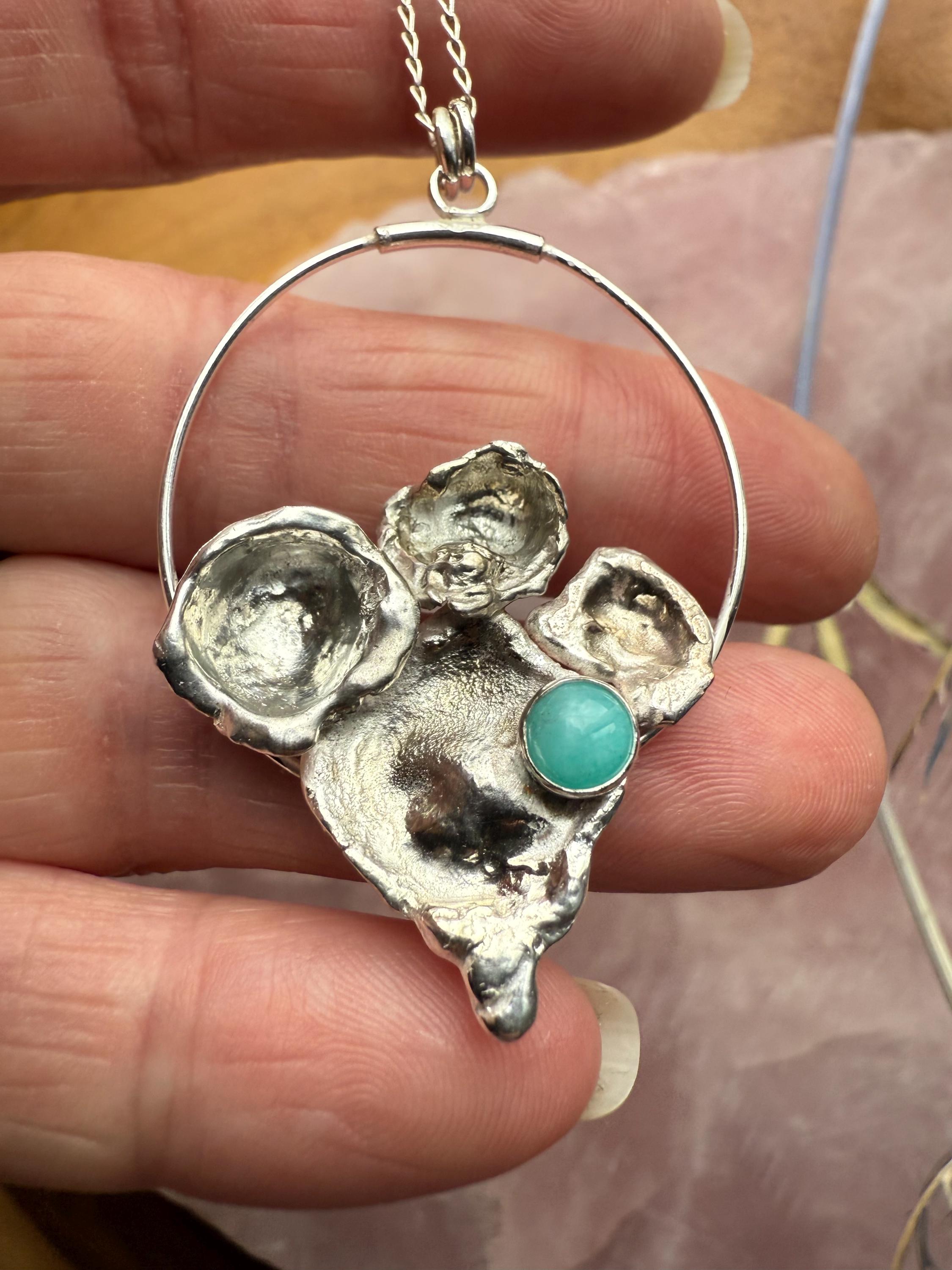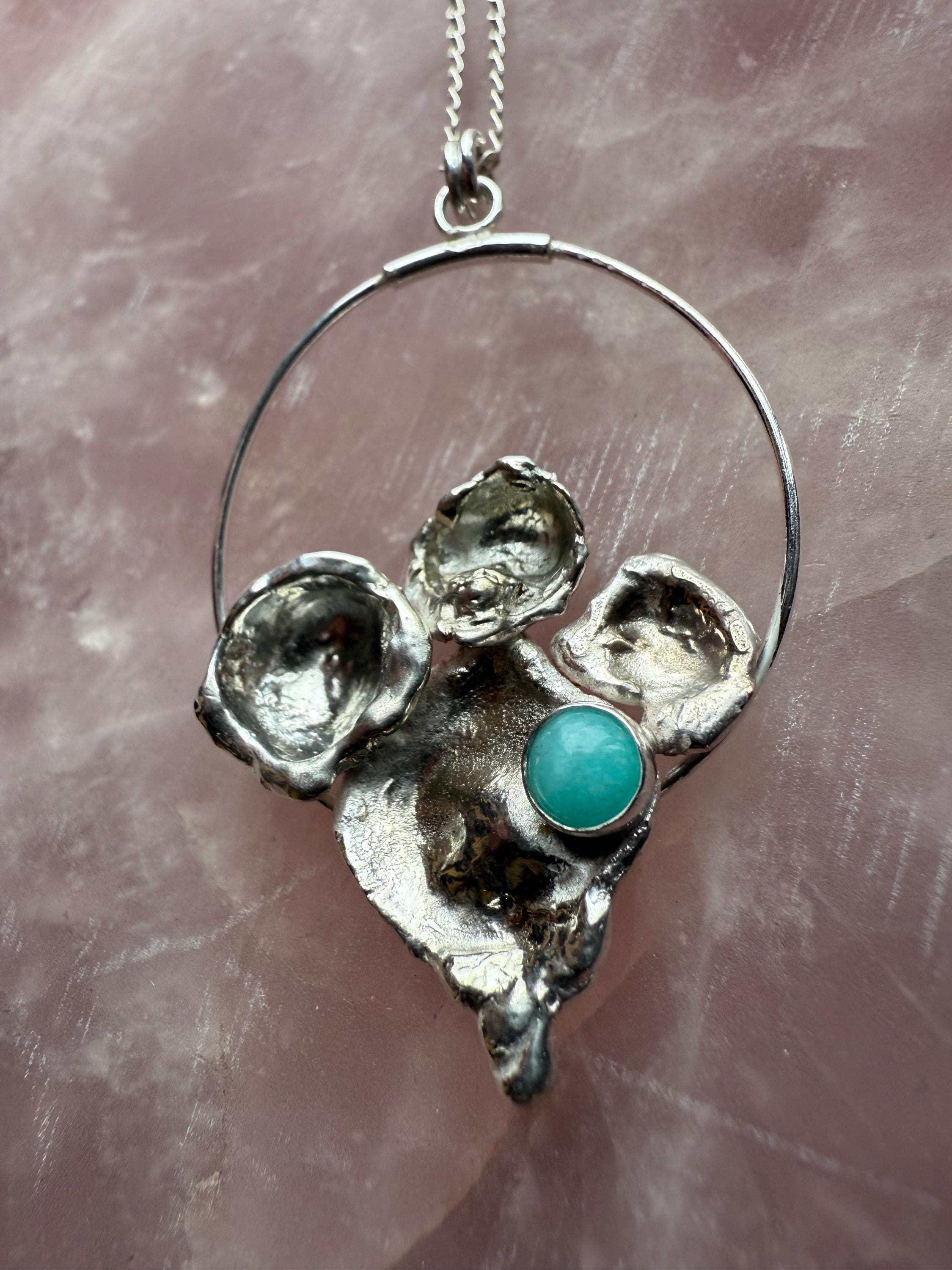 Set with a 5mm amazonite cabochon and measuring approximately 6cm in length, this pendant combines simplicity with individuality.