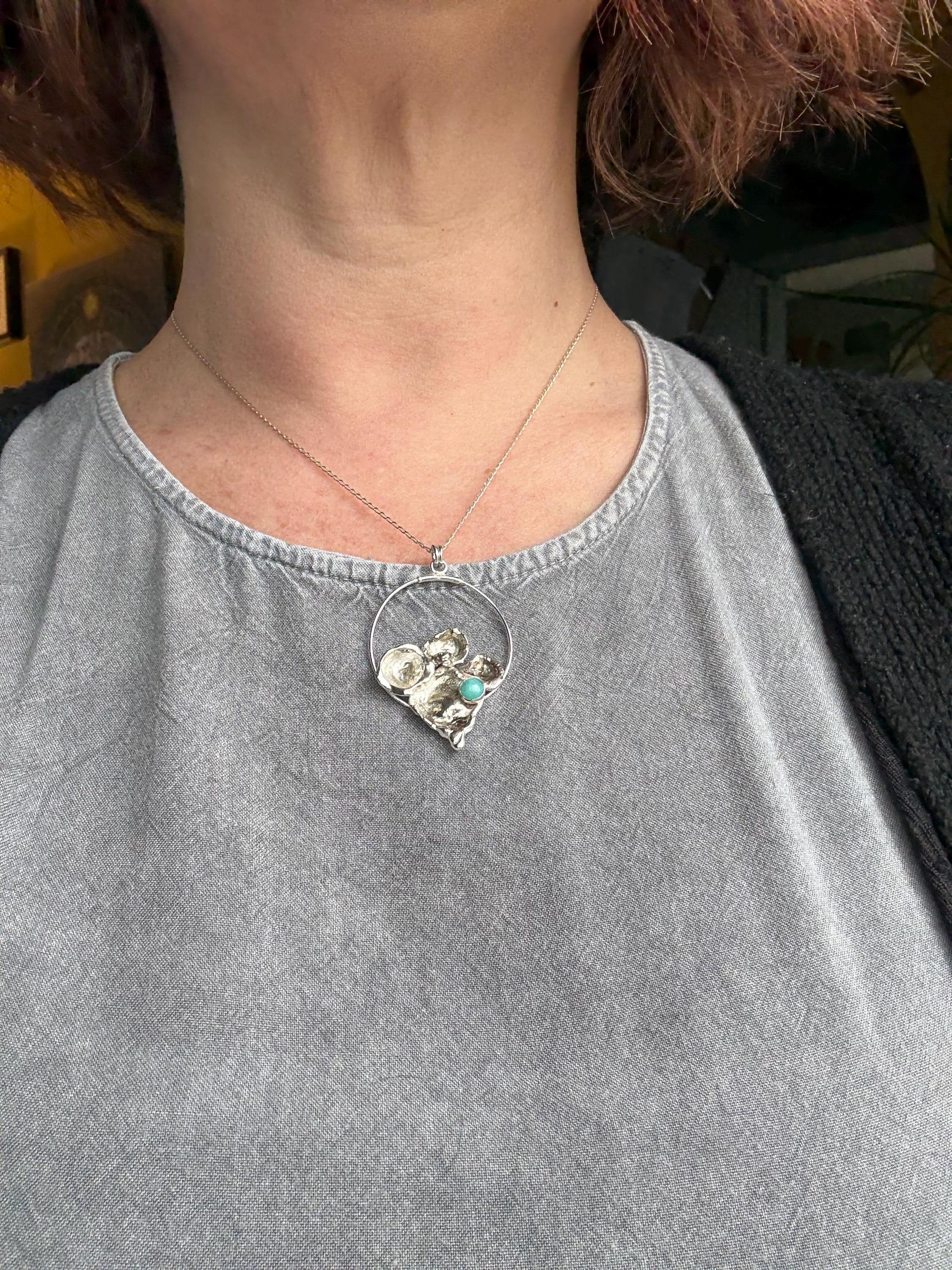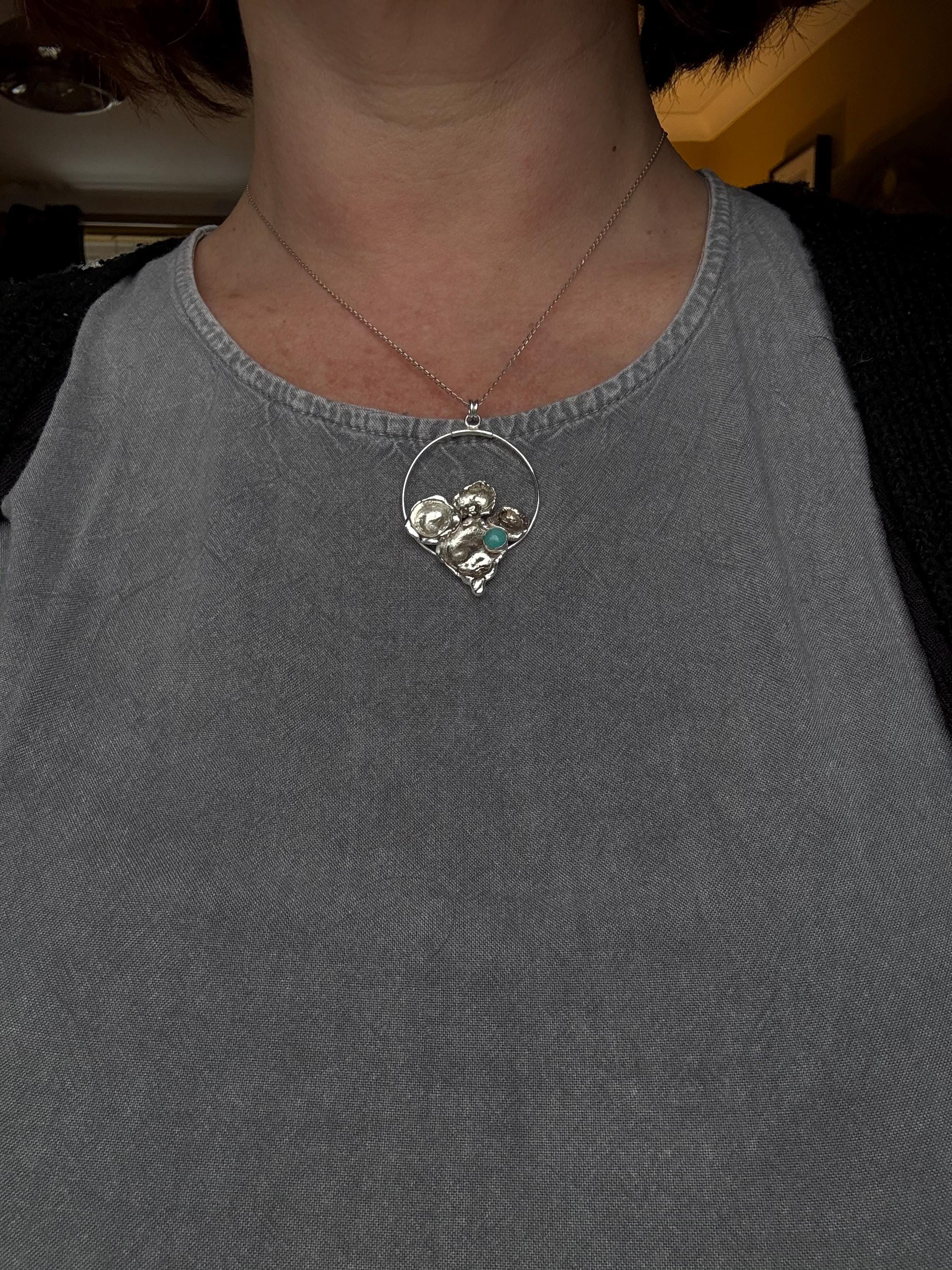 A handcrafted sterling silver necklace featuring four unique water-cast droplets arranged on a sculptural hoop. Each droplet is formed as molten silver meets water, creating organic textures and fluid, natural shapes.