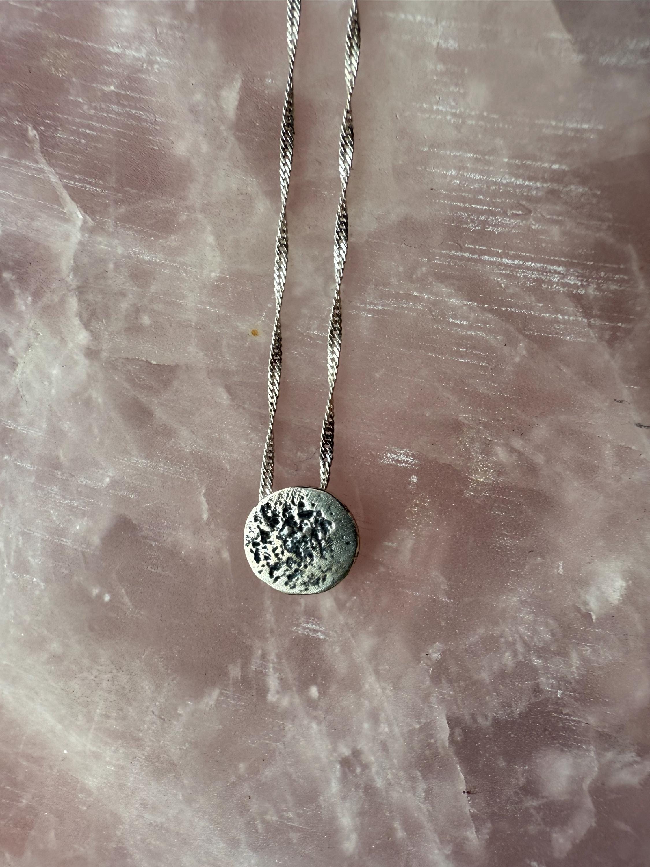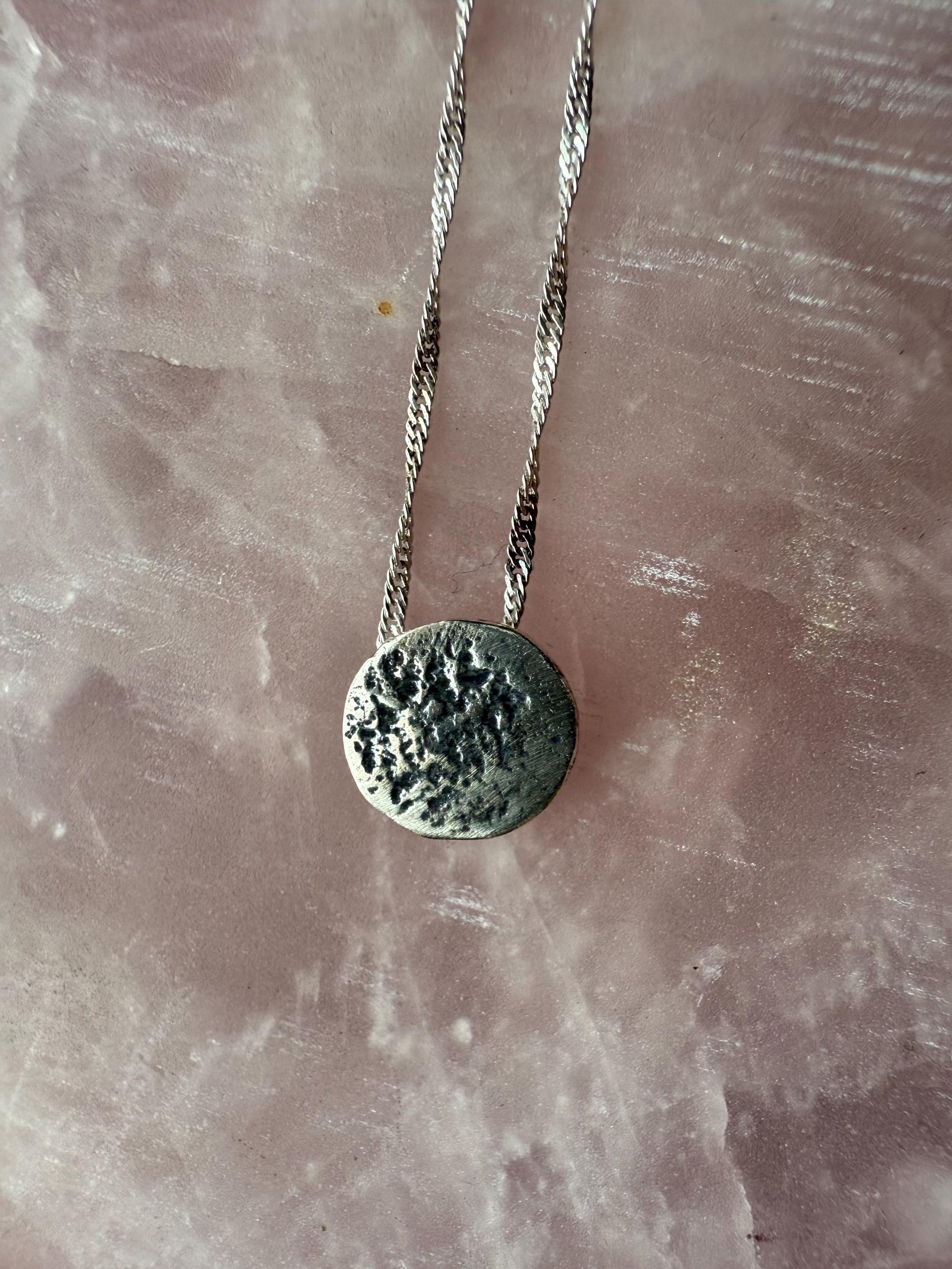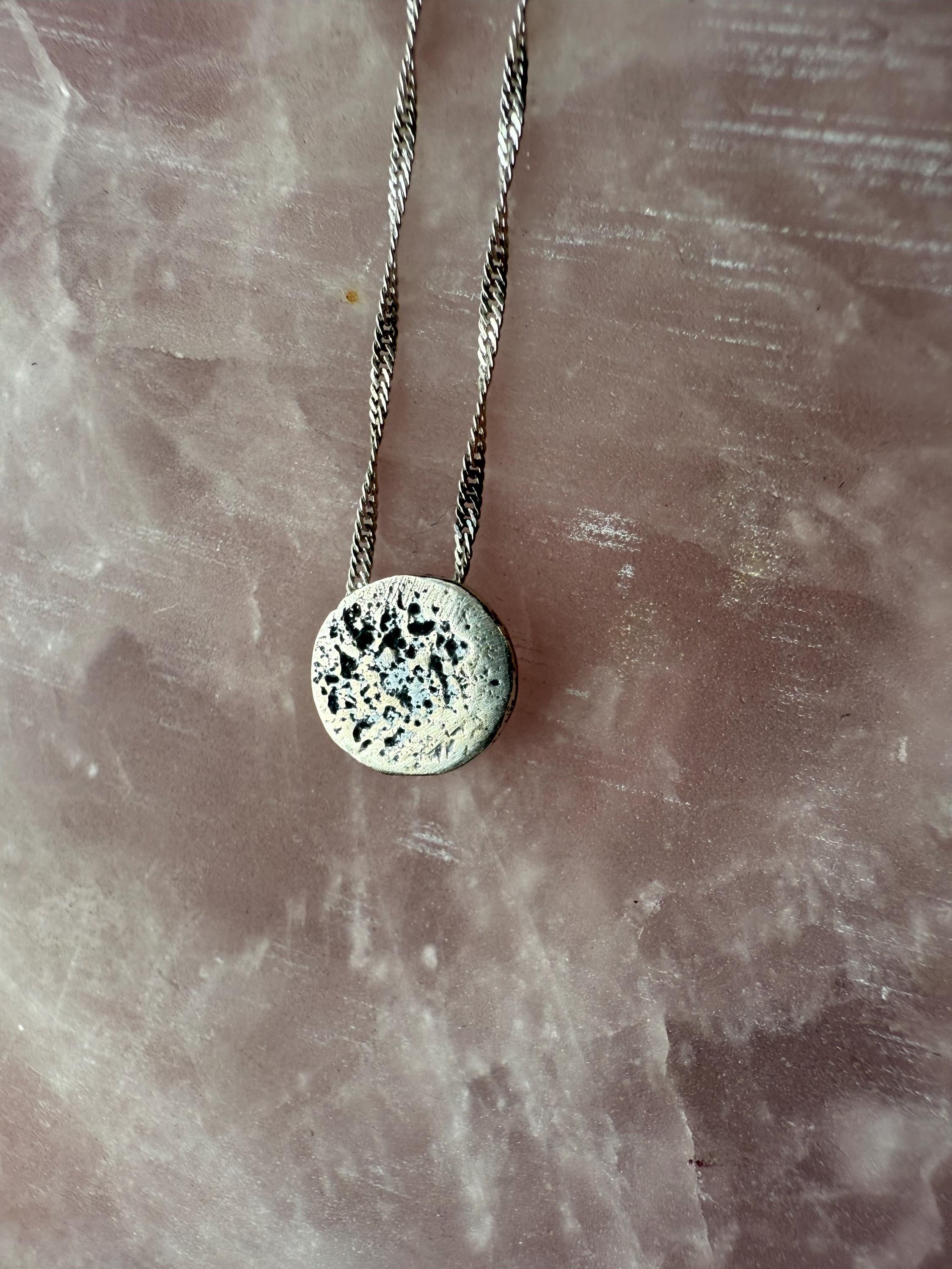 A delicate full moon pendant handcrafted from recycled sterling silver. The surface is hand-hammered to create soft crater-like textures that echo the moon’s natural form.