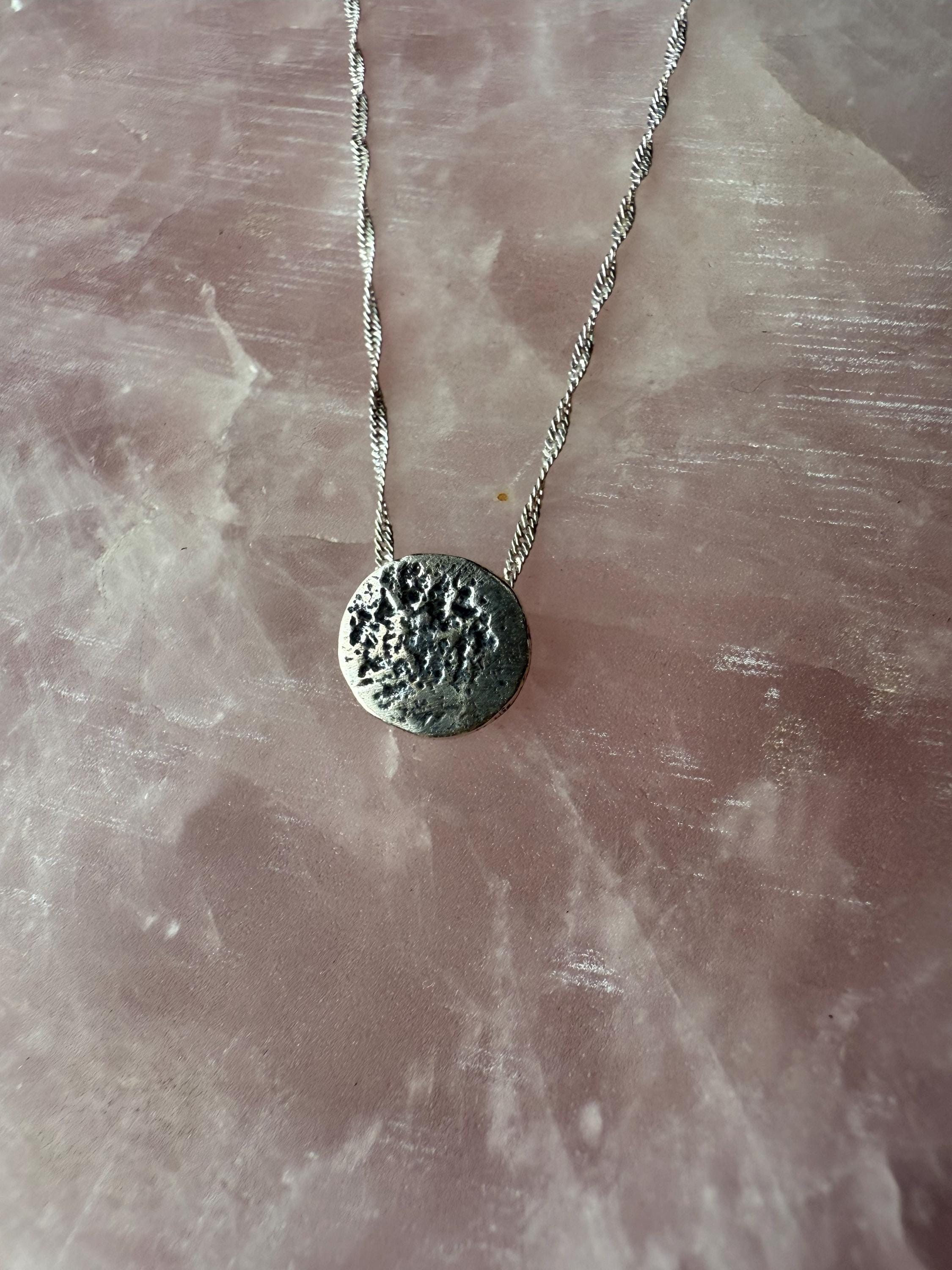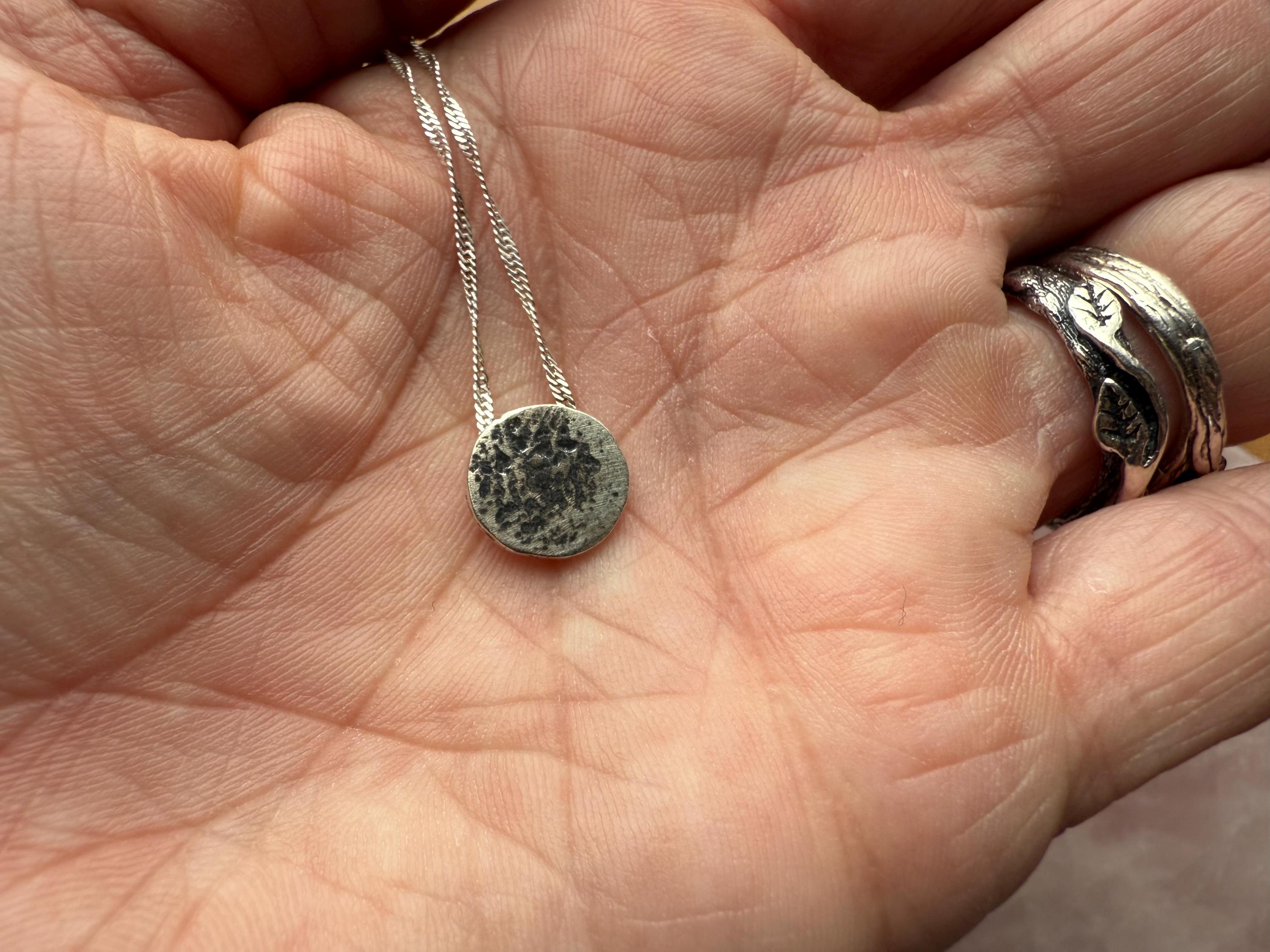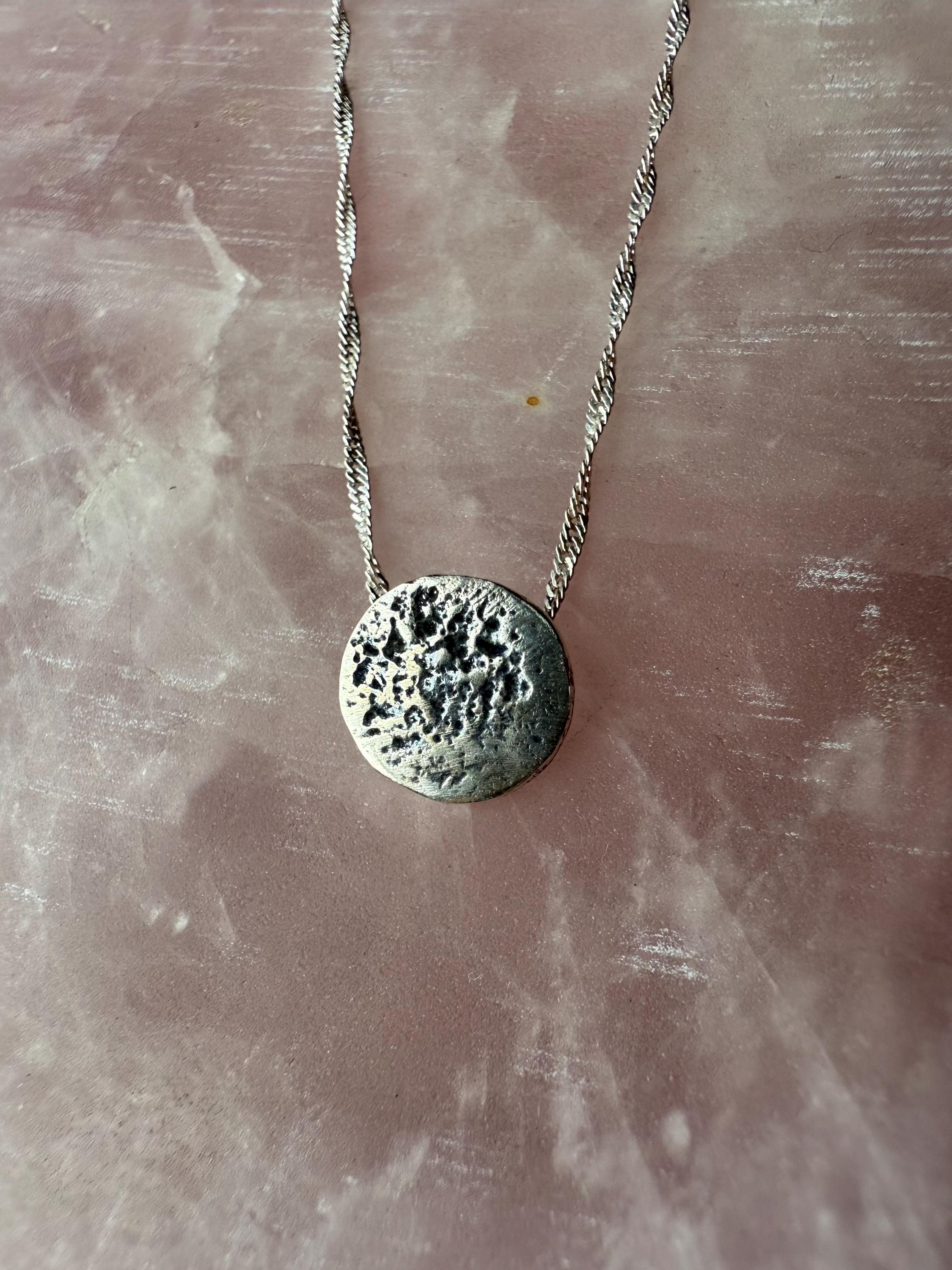 A delicate full moon pendant handcrafted from recycled sterling silver. The surface is hand-hammered to create soft crater-like textures that echo the moon’s natural form.